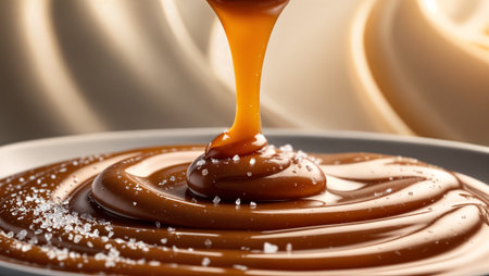 Rich golden caramel sauce pours in elegant streams onto glossy chocolate surface, garnished with sea salt crystals, creating mesmerizing circular patterns in warm, luxurious tones.