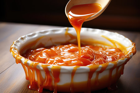 A close-up view of warm caramel sauce flowing into a baking dish, showcasing its glossy and smooth texture, ideal for dessert lovers and culinary enthusiasts.