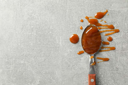 Spoon with caramel on grey background, space for text