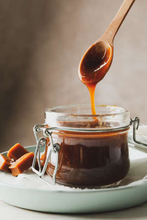 Homemade salted caramel with a spoon and napkin on the table. Delicious dessert