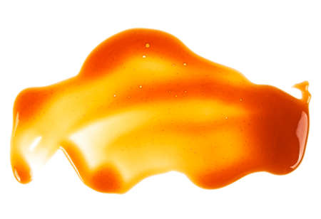 Drops of caramel in sweet sauce on white background.