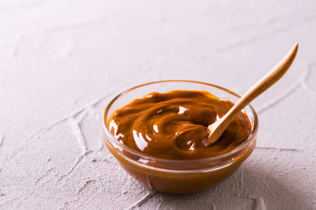 Bowl of homemade melted caramel sauce on stone backgroung
