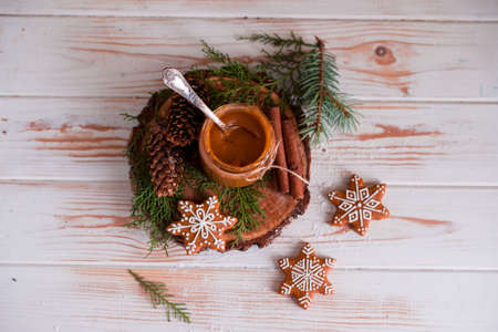 Christmas cookies with homemade salted caramel on a wooden background, neon lights, cinnamon sticks. New years 2020