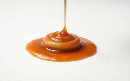 Caramel being poured onto a white surface, creating a swirl of sweet, sticky goodness