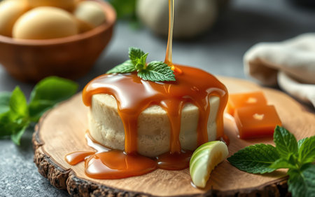 A creamy dessert is drizzled with caramel sauce on a wooden platter with fresh mint