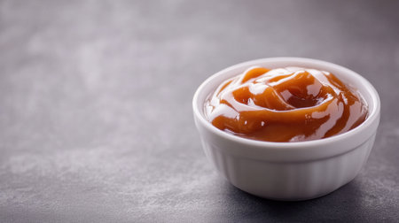 Salted caramel in a glossy bowl, placed on a pristine background, offering an inviting image with ample copy space