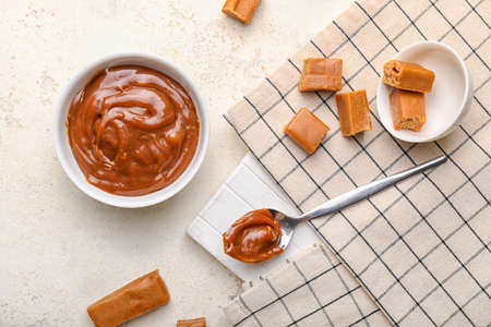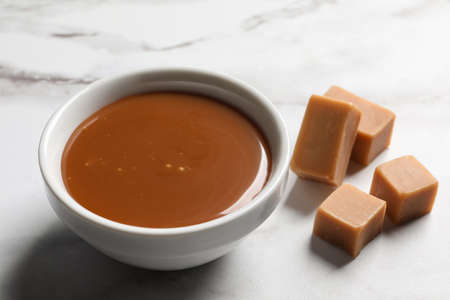 Yummy salted caramel in bowl and candies on white marble table