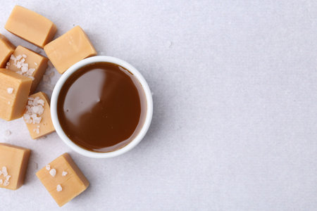 Tasty salted caramel in bowl and candies on light gray table, top view. Space for text