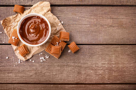 Melted caramel in bowl with salted caramel candies on wooden background. Top view. Copy space.