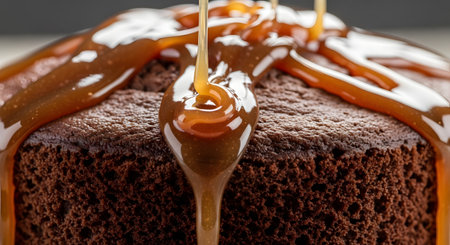 Thick, golden caramel sauce is poured over a rich chocolate cake, dripping down the sides. The close-up captures the glossy texture and indulgent appeal of the dessert.