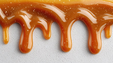 A close-up view of rich, glossy caramel sauce dripping elegantly on a white surface. The texture showcases sparkling details, enhancing its appetizing appeal.