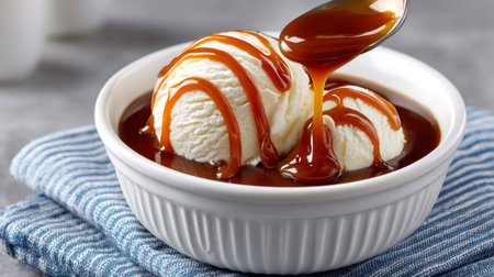 drizzling caramel sauce on a scoop of ice cream, created with generative ai