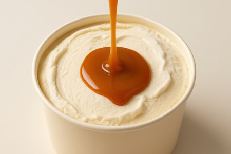 Creamy vanilla ice cream in a white cup with rich caramel sauce drizzling over the smooth surface on a neutral background.