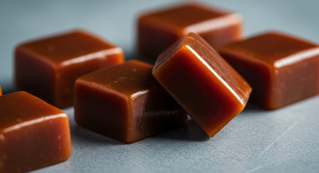 Smooth, glossy amber caramel squares arranged on a light gray surface. the candies have a rich, deep brown color and a reflective finish, highlighting their sweet and indulgent texture. perfect for confectionery and dessert themes.