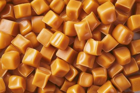 Close-up of caramel cubes. Texture, detail, and background visible. Sweet food.