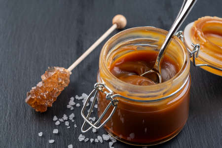 Homemade salted caramel sauce. Selective focus, space for text. On dark background