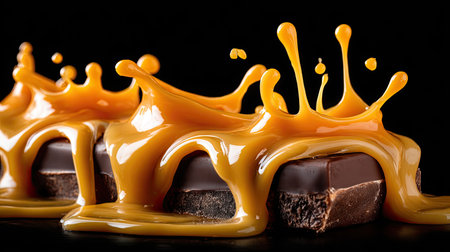 A stunning close-up of rich chocolate bars topped with luscious caramel, creating an eye-catching splash effect against a black backdrop.