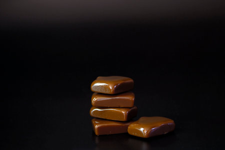 A pile of caramel candies on a black background, copy space