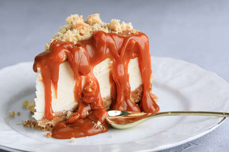 Slice Of Classical New York Cheesecake On White Plate. Closeup View. Cheesecake with caramel