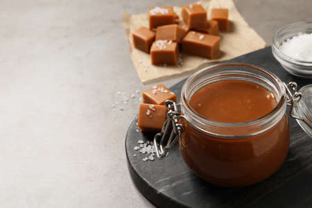 Tasty salted caramel in glass jar on gray table, space for text