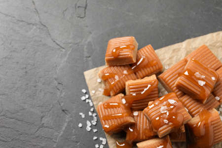 Tasty caramel candies with sauce and sea salt on gray table, above view. Space for text