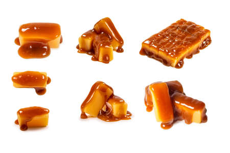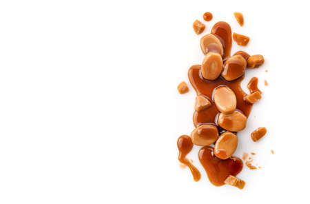 Caramel candies and caramel sauce isolated on white background. Top view. Copy space.
