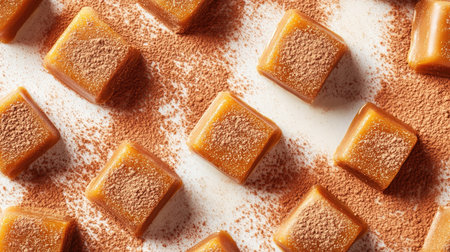 A close-up of creamy caramel candies dusted with cocoa powder, artfully displayed on a white background.