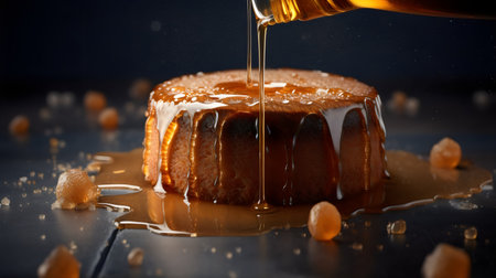 Pouring honey on a cake, close-up, selective focus