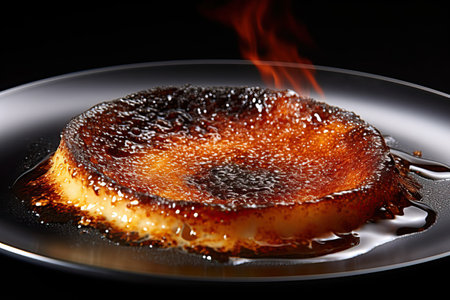 Close-up top view of creamy with caramelized sugar on top, centered in the image with negative space around it for copy or branding. -