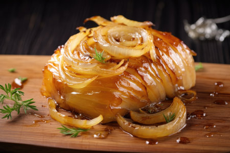 caramelized onions atop a honey mustard glazed chop, created with generative ai