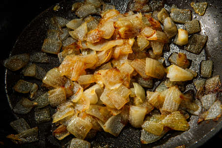 Close up of sauteed onion and garlic in the frying pan. Man preparing dinner. Cooking at home concept. selective focus. horizontal shot