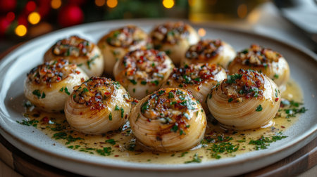 Freshly cooked garlic snails are served in a traditional dish, topped with herbs and butter, showing culinary skills in a fine dining setting.