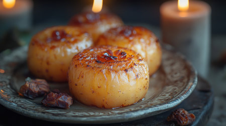 Three caramelized onions on a plate, with dates nearby, lit by candlelight.