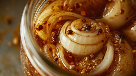 A close-up shot of pickled onions in a glass jar, showcasing their vibrant colors and textures. Perfect for enhancing dishes or as a culinary inspiration.