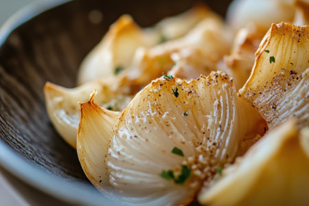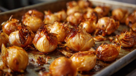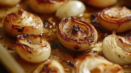 A close-up view of beautifully roasted onions displaying a rich golden brown color and crispy texture, ideal for enhancing any meal or culinary creation.
