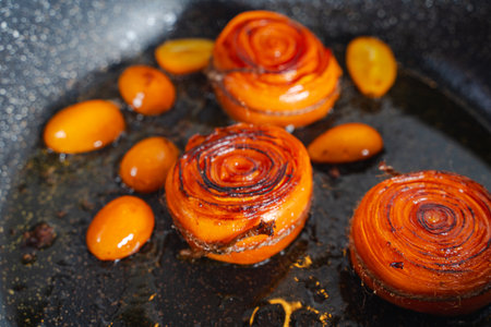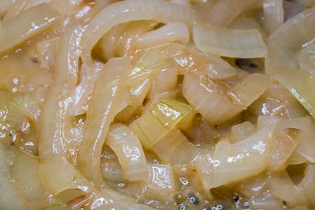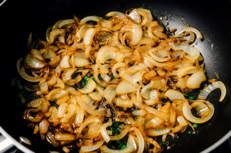 Sizzling caramelized onions cooking in pan