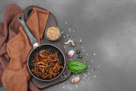 Fried Shimeji mushrooms with garlic, basil, and spices in a pan, served on a dark background with a rustic wooden board. Vegan lifestyle concept, flat lay, top view