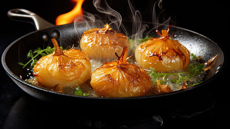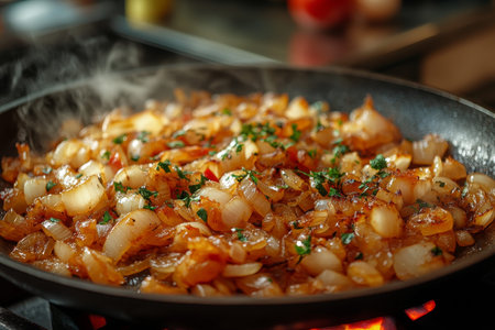 Golden onions sizzle in a skillet, releasing a savory aroma and steam. Perfect for culinary creations, showcasing the delightful cooking process in a kitchen atmosphere.