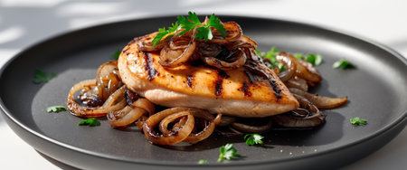 AI Generated. Grilled Chicken Breast with Caramelized Onions and Parsley on a Dark Plate