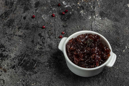 Red onion marmalade jam confiture in jar. Vegetable jam on dark background. Delicious sauce. french cuisine. Food recipe background. space for text.