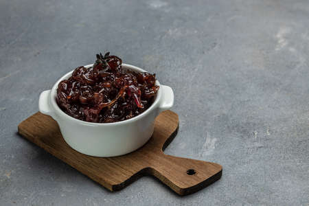 Red onion marmalade jam, confiture, chutney with wine and thyme on a gray background, Delicious sauce. gourmet. banner, menu, recipe place for text, top view