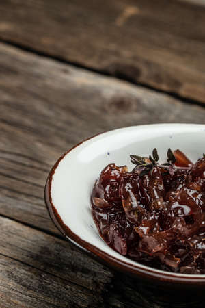 Red onion marmalade jam, confiture, chutney with wine and thyme on a wooden background, Delicious sauce. gourmet. banner, menu, recipe place for text, top view