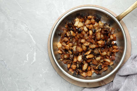 Tasty fried cracklings on light marble table, flat lay with space for text. Cooked pork lard