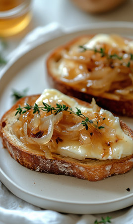 Two slices of toasted bread are generously topped with golden caramelized onions and garnished with fresh herbs.