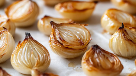 A close-up of roasted shallots with their caramelized, golden-brown skins, showing the tender and flavorful result of roasting on a simple white surface.