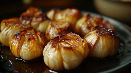 Close-up of roasted garlic cloves on a dark plate, showcasing their crispy texture and rich, savory flavor. Perfect for culinary inspiration and delicious dishes.