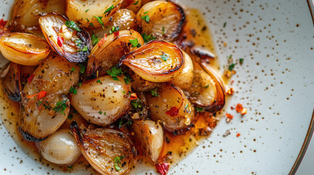 An elegant dish featuring roasted shallots, garnished with herbs and spices, beautifully plated against a neutral background, inviting culinary exploration