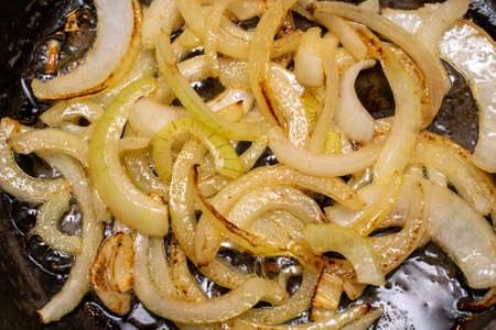 macro appetizing golden fried onion with oil in black frying pan