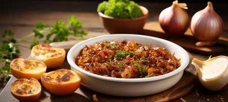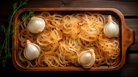 onion slices, arranged in a circular pattern, occupy the center of a rustic wooden tray, showcasing their translucent layers and delicate texture, perfect for adding flavor to various dishes, from savory soups to flavorful salads and hearty stews. ai generated