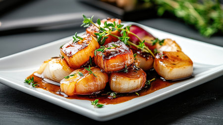 A beautifully presented dish of grilled scallops garnished with fresh herbs and a rich sauce, perfect for gourmet dining or special occasions.